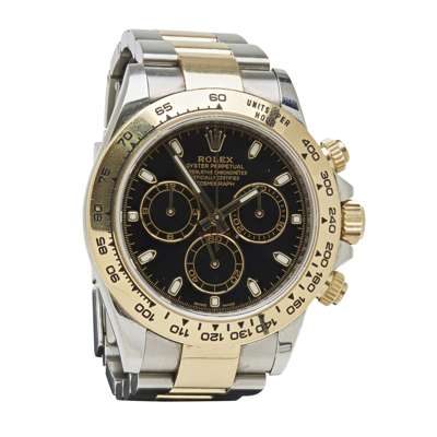 Daytona Cosmograph, Oyster Perpetual, Superlative Chronometer, Officially Certified, Cosmograph, black and gold dial, date aperture, screw down crown and buttons, Oyster bracelet, with oysterlock