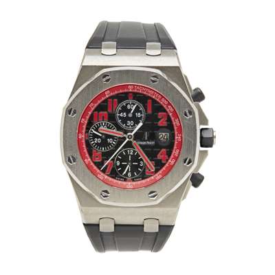 Royal Oak Queen's Road, limited edition, 052/100, titanium case, black textured dial, applied red Arabic numerals, date aperture, black register dials and outer red tachymeter dial, black rubber strap with deployant clasp