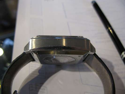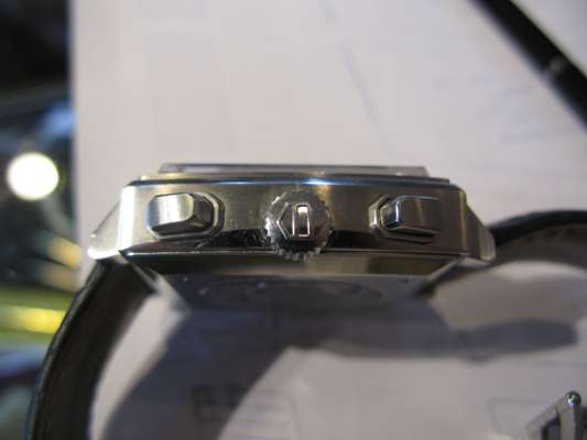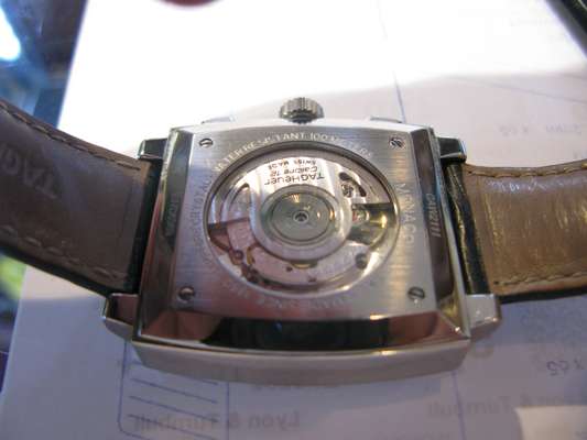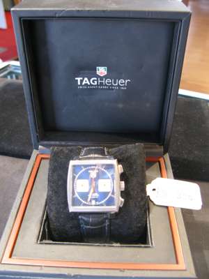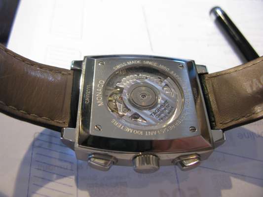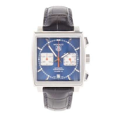 Monaco, Calibre 12, classic square case with blue dial, red hands, off white register dials, date aperture, Tag leather strap, correct buckle with fold over clasp, sapphire crystal to back, visible automatic movement