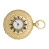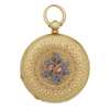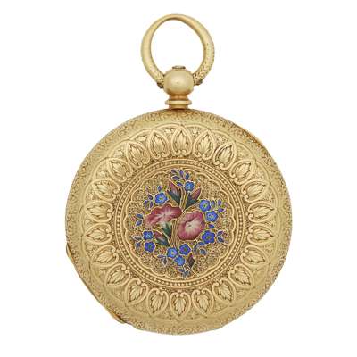 in a demi hunting case, key wind, outer case with blue enamel chapter ring, floral enamel panel to the back cover, white enamel dial, plain movement, hoop suspension