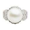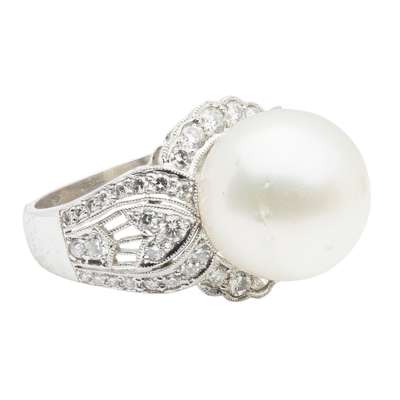 set with a large South Sea pearl, in a border of small round brilliant cut diamonds, the shoulders with pierced round brilliant cut diamond detail, to a plain shank stamped 18k 750