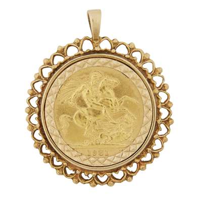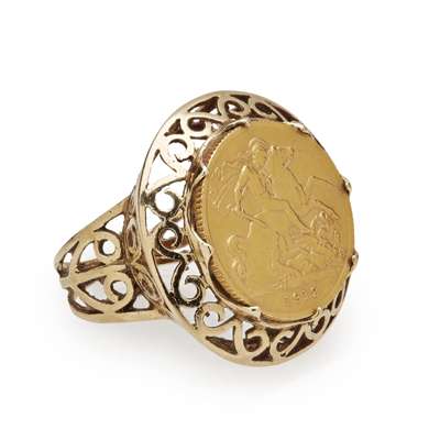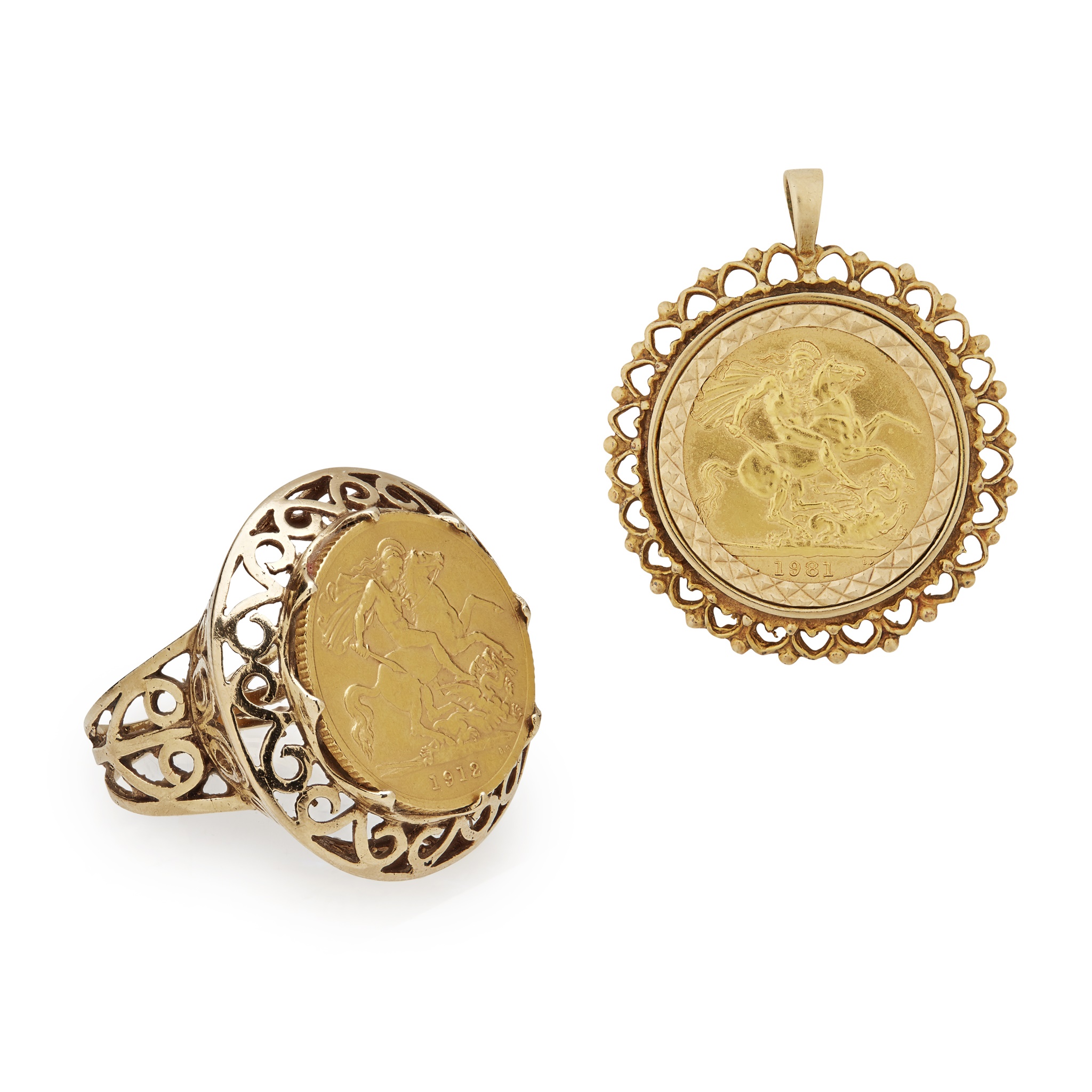 a half sovereign ring with pierced mount, 1912; the sovereign pendant in 9ct gold mount, 1981 (2)