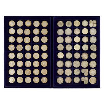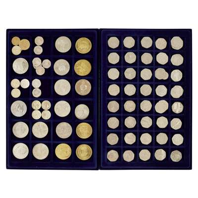 in various containers, bags of post 47 coinage and general 20th century copper and other coins; an aluminium briefcase with fitted trays containing a mixture of coins, pre 47 and pre '22 silver, condition generally worn, some Victorian noted including Gothic, some other bronze coinage, tray modern themed £2 coins (40) tray themed 50p, Olympics etc. (45), various commemorative crowns etc. (base metal, some gilt); another similar briefcase with mixed pre '47 and pre '22 silver coinage, other mixed coinage including some European modern, commemorative coinage etc. (qty)