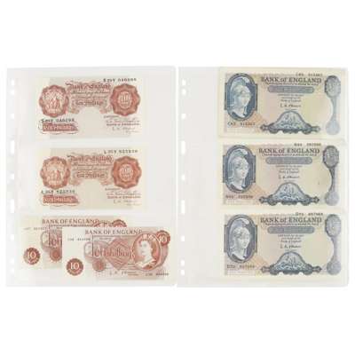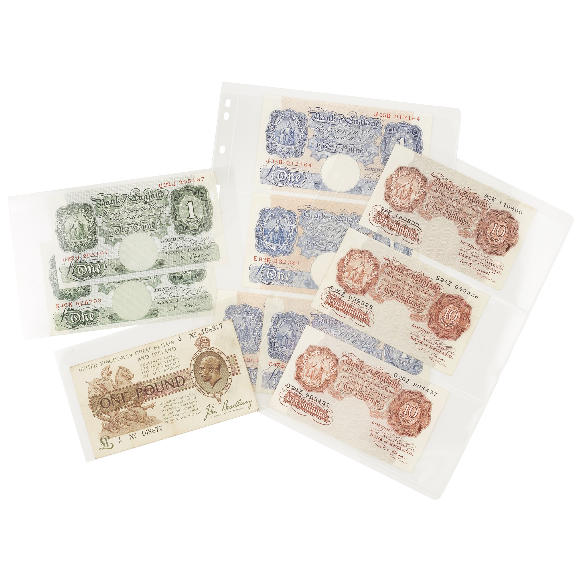 £5 x 3 Feb 1957, July 1961, 1959? B277 and B280; £1 notes - 1 x 22 January 1917, third issue, Bradbury; five Nov 1955 O'Brien Brittania pounds B273; 1950 Beale B268; 1948 x 3 Peppiatt B258 AND B260; 1934 Peppiatt B239; 1930 x 2 Catterns B225; 1928, Mahon B212; 1940 x 4 Peppiatt B249 D and E; 10/- notes; 1963 Hallom B295; 3 x Feb 1967 first series Fforde B309; 2 x Oct 1961 O'Brien B286; 2 x Nov 1955 O'Brien B271; 2 x March 1950 first series, Beale B266; Oct 1948 Peppiatt, B262; 2 x April 1940 Peppiatt threaded, B251; Oct 1934 first issue B236 (qty)