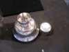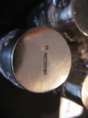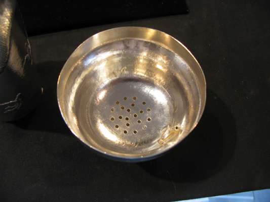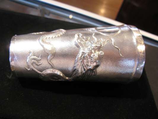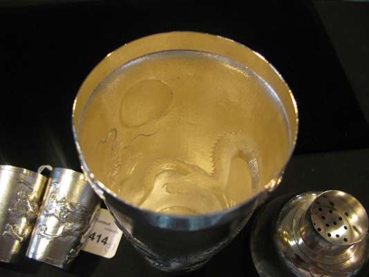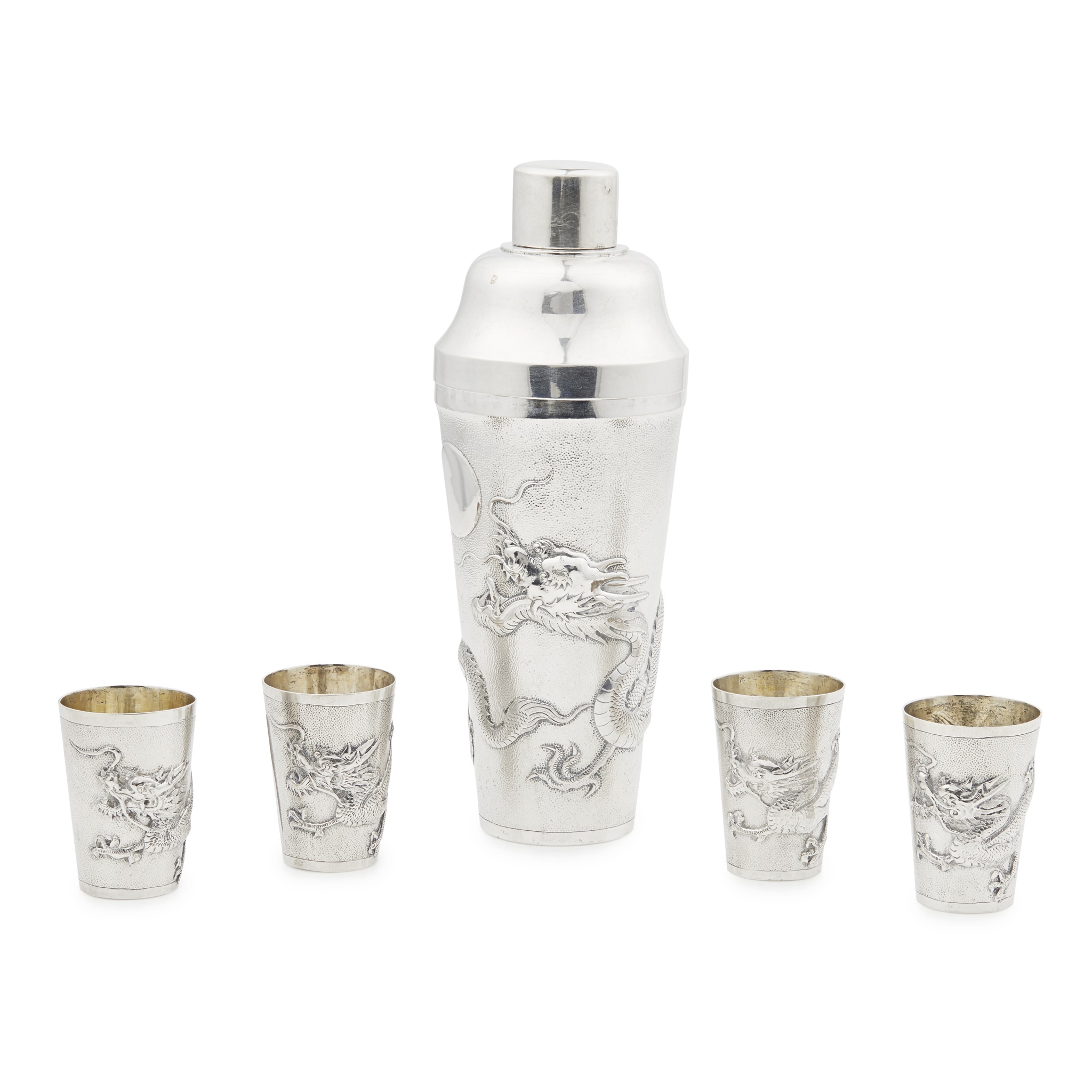 shaker with character marks and SILVER to base, the cups marked ZEE SUNG, 85 and character mark, each with embossed trailing dragon on a textured background (5)