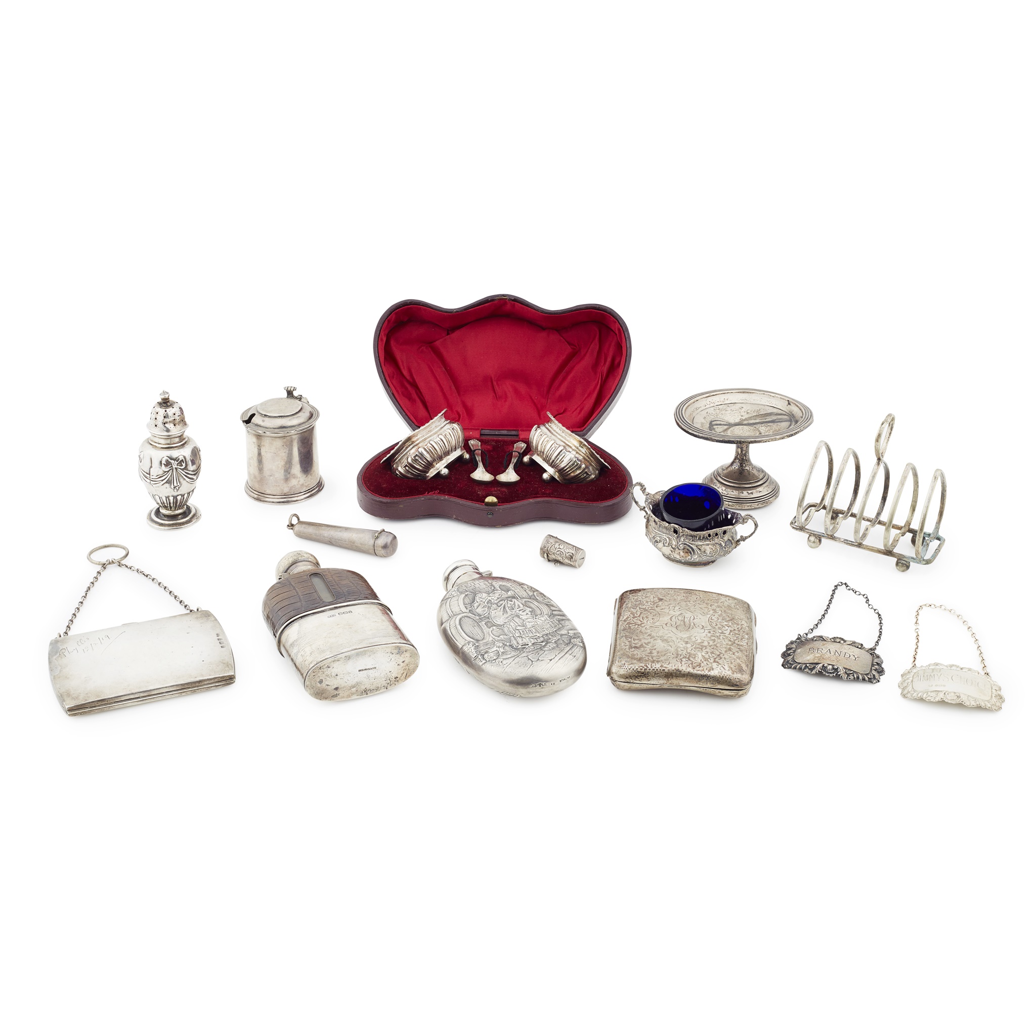 to include; an American Sterling hip flask with well embossed scenes of monks in a wine cellar; a hip flask, Mappin and Webb, pull off silver sleeve; a mustard as a lidded tankard; two wine labels; cased pair of salts by Elkington; a cigar case; a lady's minaudiere, plain with fitted interior for compact, sovereigns, cards, tazza, plated toast rack etc. (qty)