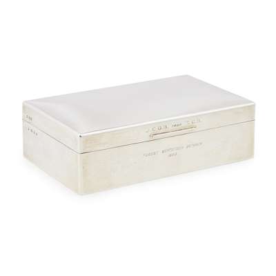 William Comyns & Sons Ltd, London 1933, of rectangular form, J.C.O.B. from T.C.B. engraved above thumb-piece, cedar wood liner with divisions