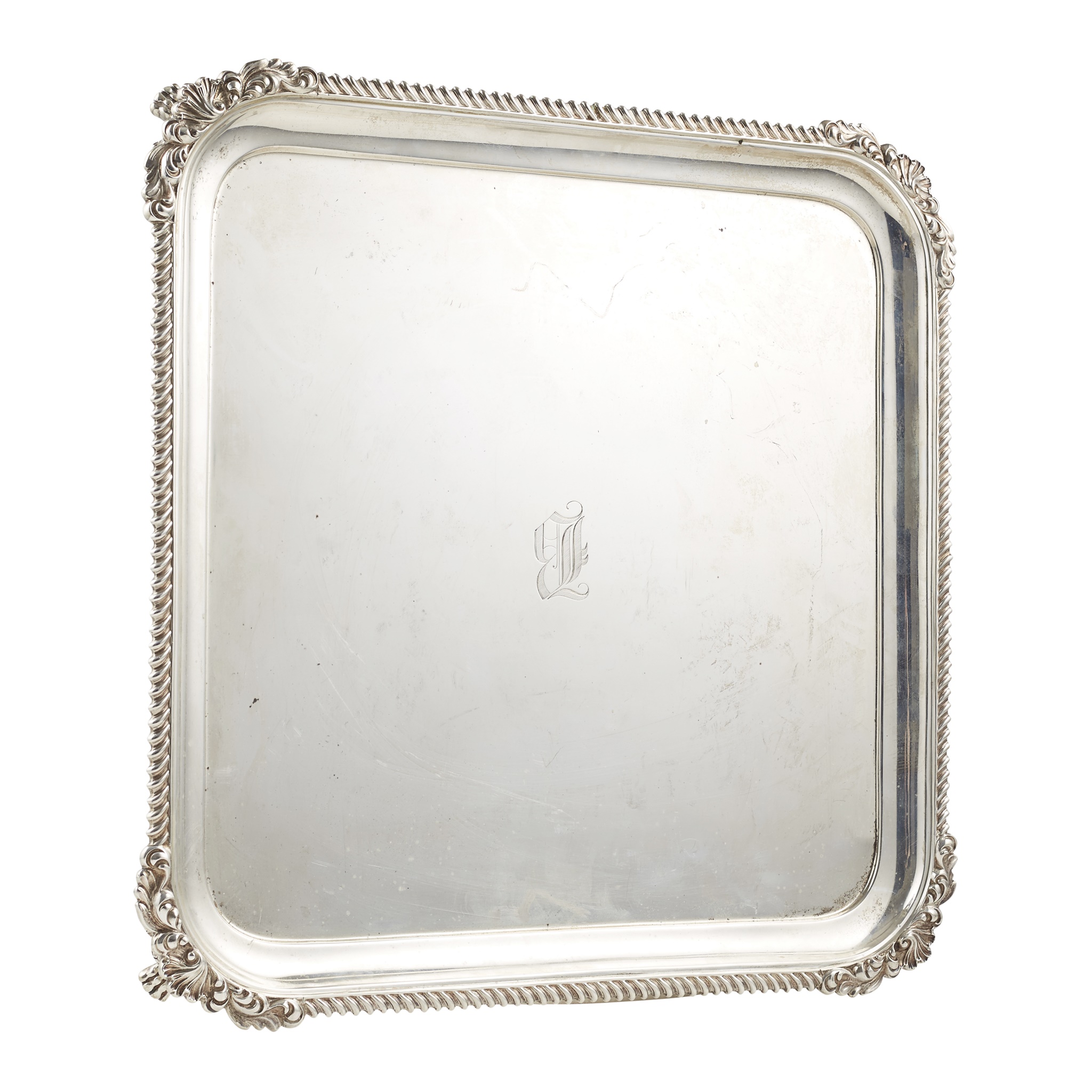 James Dixon & Sons Ltd, Sheffield 1929, retailed by MacKay & Chisholm, Edinburgh, of square outline, gadroon border, with curved cast shell edges, Gothic B to centre, raised on four bracket and paw feet