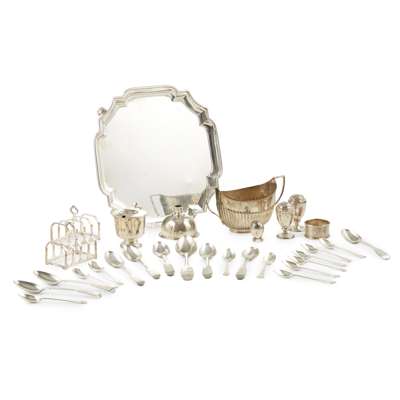 Goldsmiths & Silversmiths Co Ltd, London 1920, of moulded square form, pie crust border, raised four leaf clasped feet; together with a twin handled sugar basin, William Hutton & Sons Ltd, 1895, a mustard pot; a pair of toast racks, a damaged bell, salts; together with assorted teaspoons (qty)