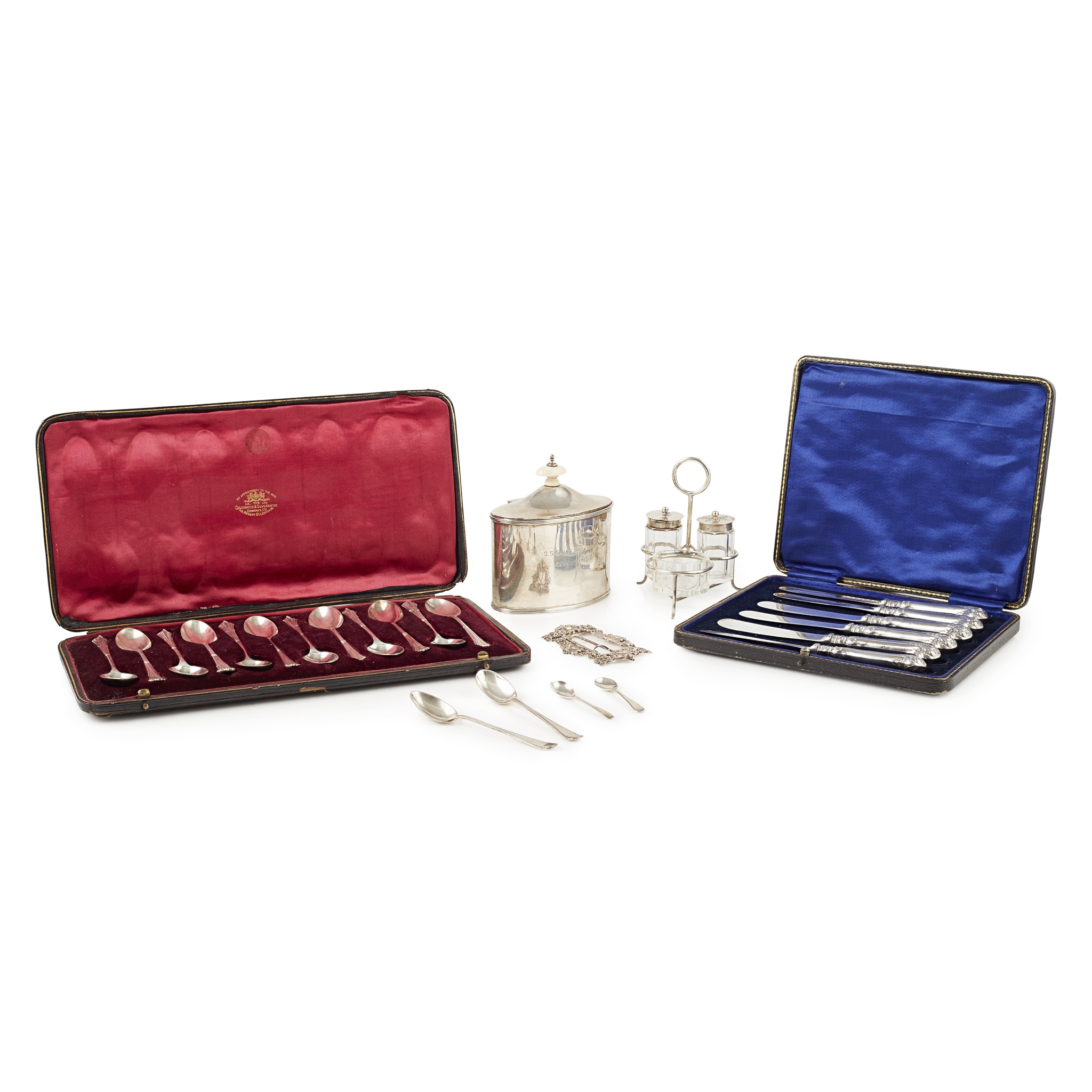 Stokes & Ireland, Chester 1916, of oval form, the hinged lid with an ivory finial engraved "S. S 'St. BARCHAN'/ 3rd July 1917 to body; together with a cased set of twelve teaspoons, Goldsmith and Silversmiths Company, London 1902, of Albany pattern; a cased set of six pistol grip silver handled butter knives; an Edwardian cruet set, Asprey, London 1909; a pair teaspoons, Joseph Rogers, Sheffield 1910 and a buckle, Chester 1896 (qty)