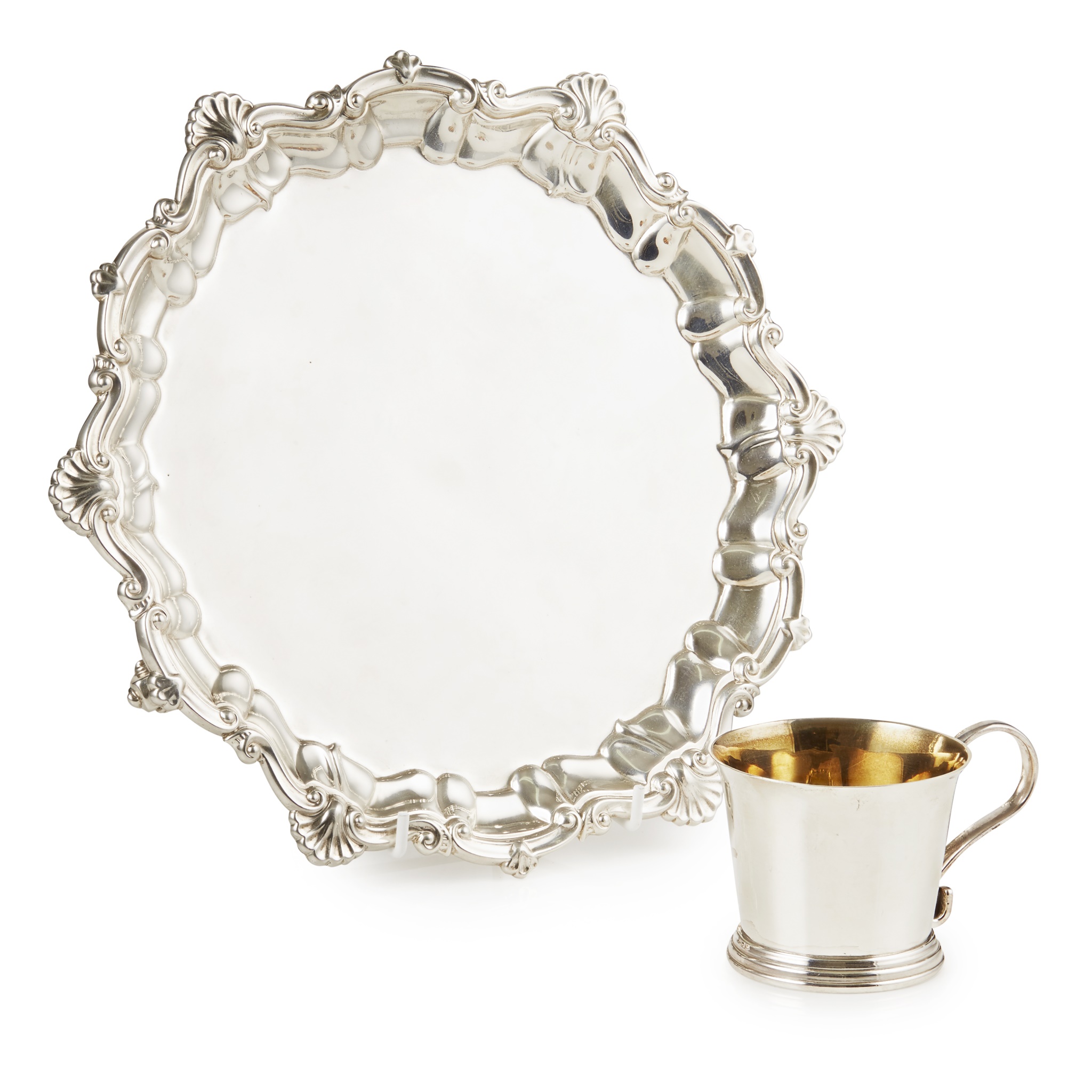 West & Son, Dublin 1912, of moulded circular form, cast shell and scroll border, raised on three leaf clasped scroll feet; together with an Irish cup, Royal Irish Silver Ltd , Dublin 1967, of tapered form, stepped foot S scroll handle, feature hallmarks to body with import marks from the Sheffield Assay Office (2)