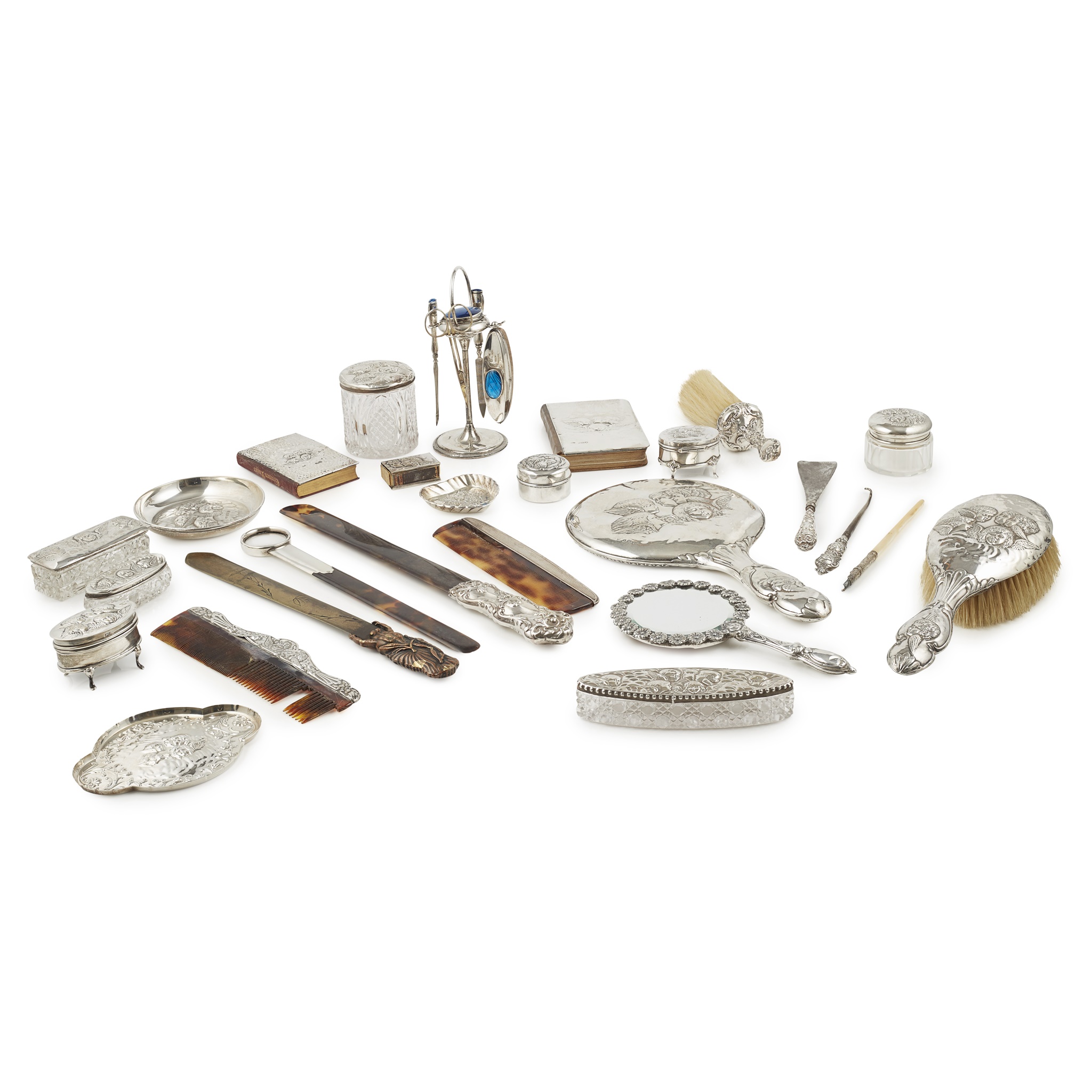 various makers and marks, including brushes, combs, dressing table jars, two books of common prayer, vesta case, pin trays, mirror all with embossed cherubic design; together with an enamel manicure set; various silver mounted page turners, mirrors and dressing table items (qty)
