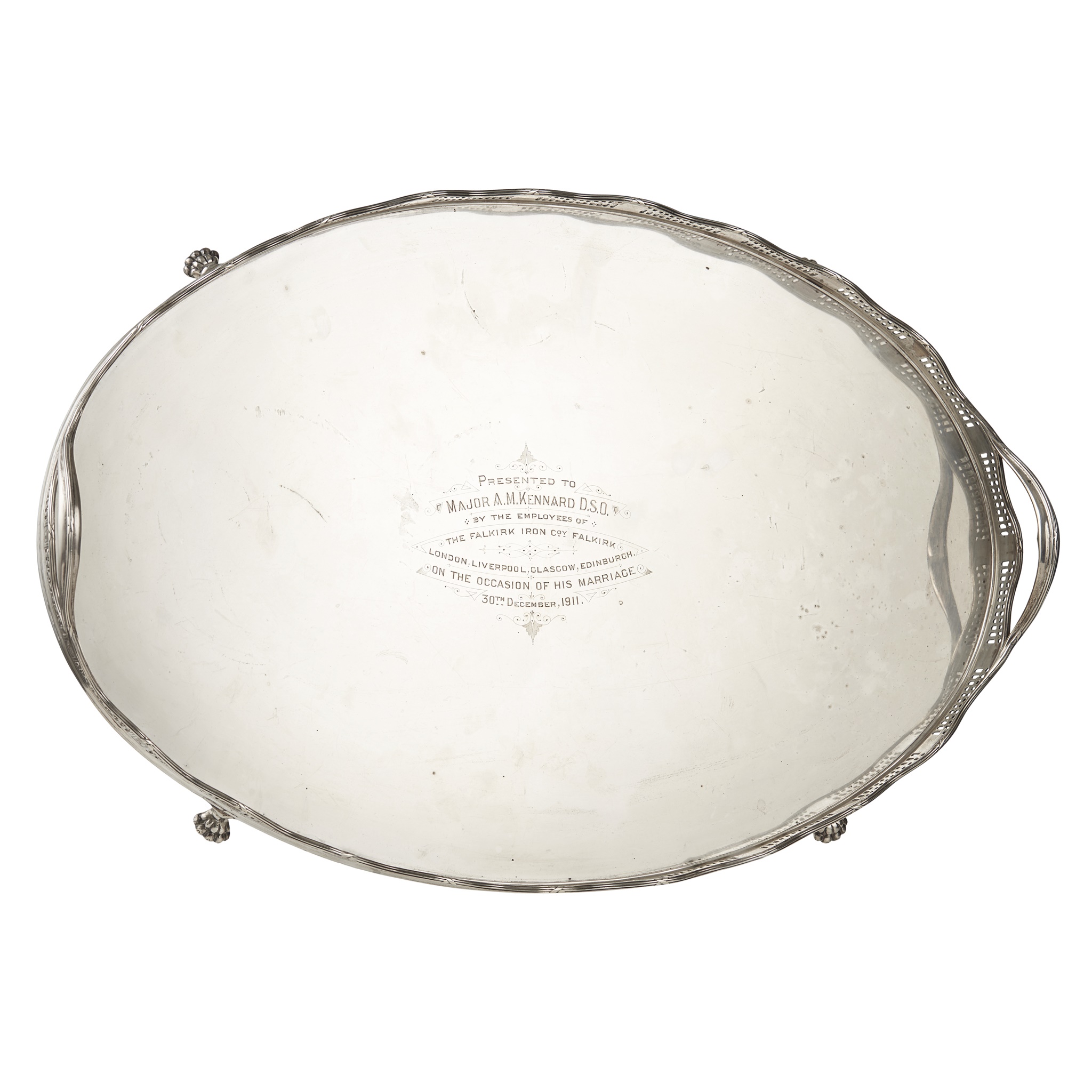 George Edward & Sons, Sheffield 1908, of oval form, pierced gallery with acanthus swags, alternating Grecian style plaques, presentation engraving to centre, PRESENTED TO MAJOR A.M. KENNARD D.S.O./ BY THE EMPLOYEES OF/ THE FALKIRK IRON COy FALKIRK/ ... ON THE OCCASION OF HIS MARRIAGE... / 30TH DECEMBER 1911, raised on four paw feet
