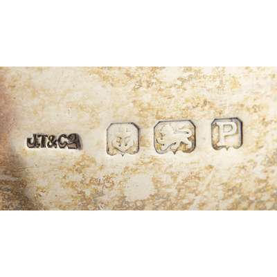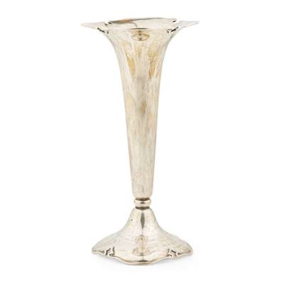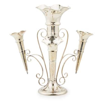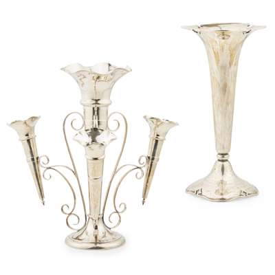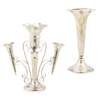 Walker & Hall, Sheffield composed of a main removable vase, the three scrolling branches with smaller vases, each vase with of tapering form, undulating rim; together with another large spill vase, of moulded circular form, with presentation engraving to base 'GREYHOUND RACING ASSOCIATION LTD/ WHITE CITY STADIUM' loaded (2)