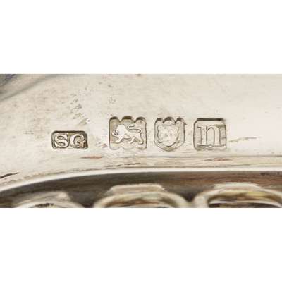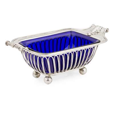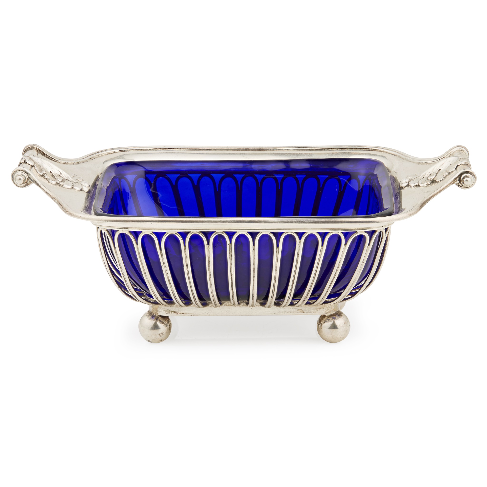 Garrard & Co Ltd, London 1908, of moulded rectangular form, the body composed of rounded bars, cast leaf clasped handles, raised on four ball feet and with blue glass liner