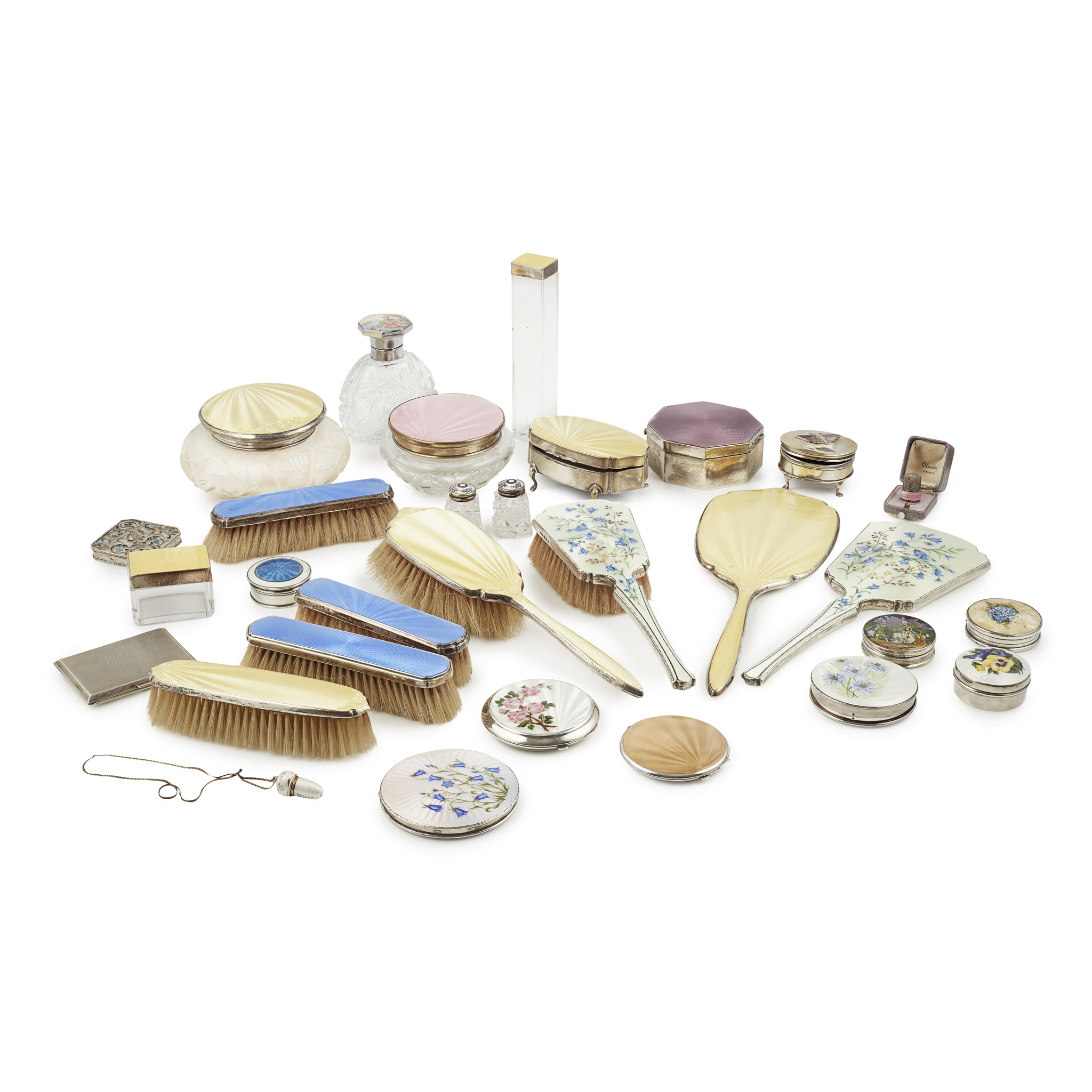A good collection of enamelled dressing table brushes and accessories