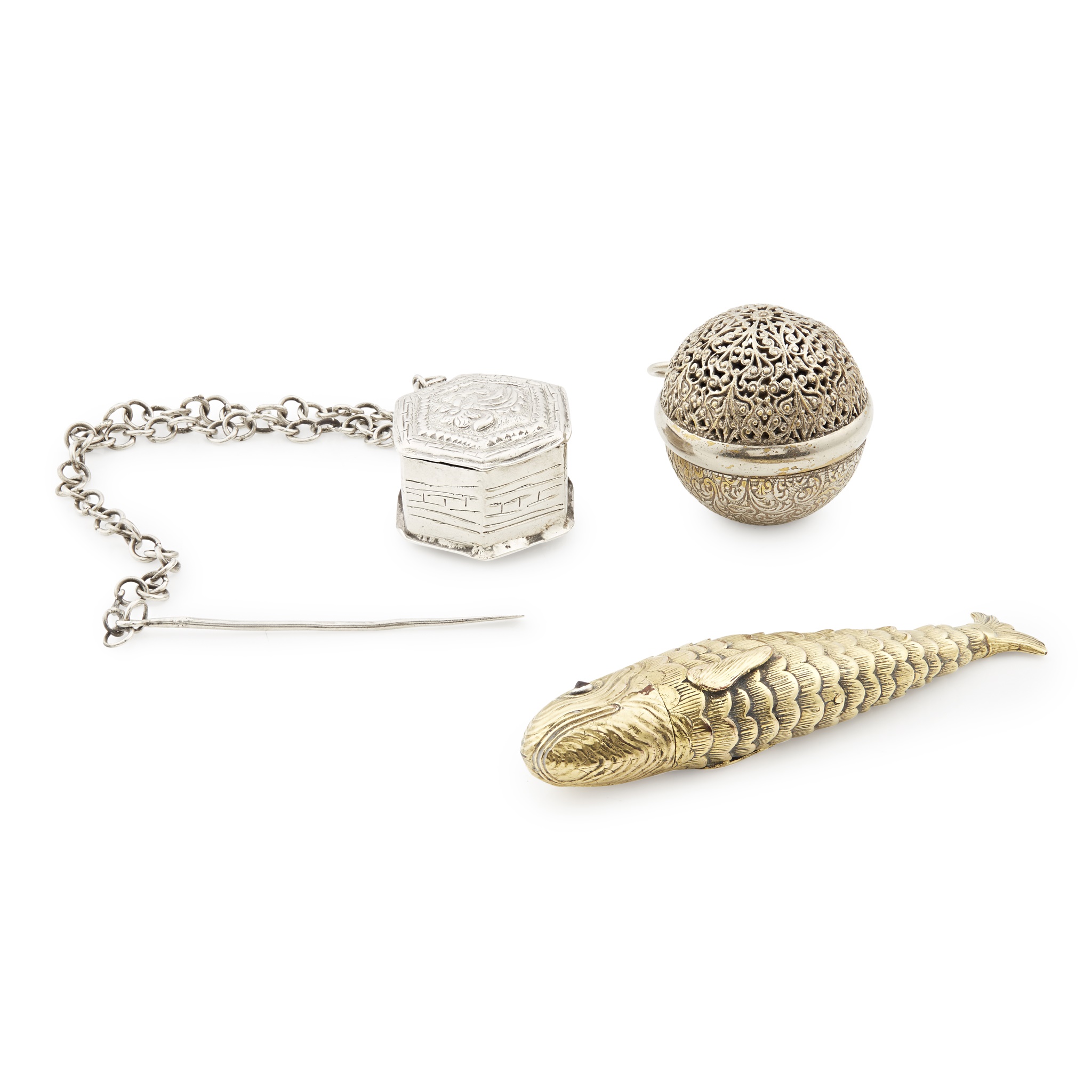 apparently unmarked, modelled as fish, gem set eyes; together with a spherical plated pomander and an eastern 18th century snuff box and cover with chain and small spoon (3)