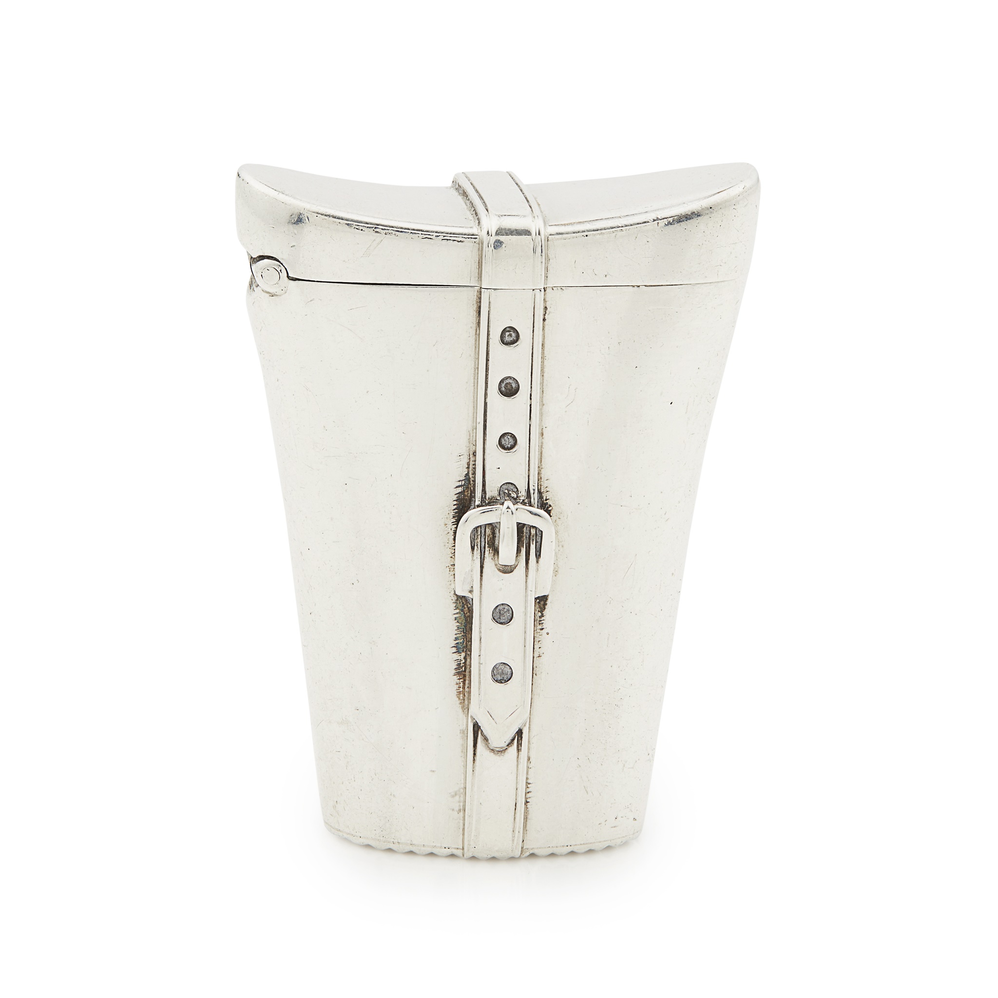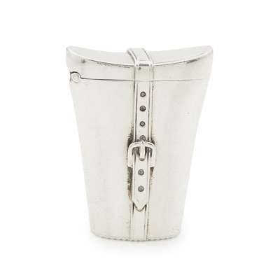 Samson Morden & Co, London 1897, formed as a leather saddle back with strap and buckle, with hinged cover and striker to base