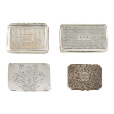 John Shaw, Birmingham 1811, of plain form, slight rounded corners, the cover with well engraved armorials; Thomas Shaw, Birmingham 1826, rectangular form with engine turned decoration and initials; Edward Smith, Birmingham 1829, similar; and another circa 1926, slight damage to the cover