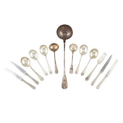 Robert Gray & Son, Glasgow 1830, of Fiddle and Shell variant pattern; together with a set of five modern soup spoons, Walker & Hall, Sheffield 1969, a set of twelve knives 1968, and one fork of the same pattern, 1970; together with a Georgian sauce ladle and a plated sauce ladle (9)