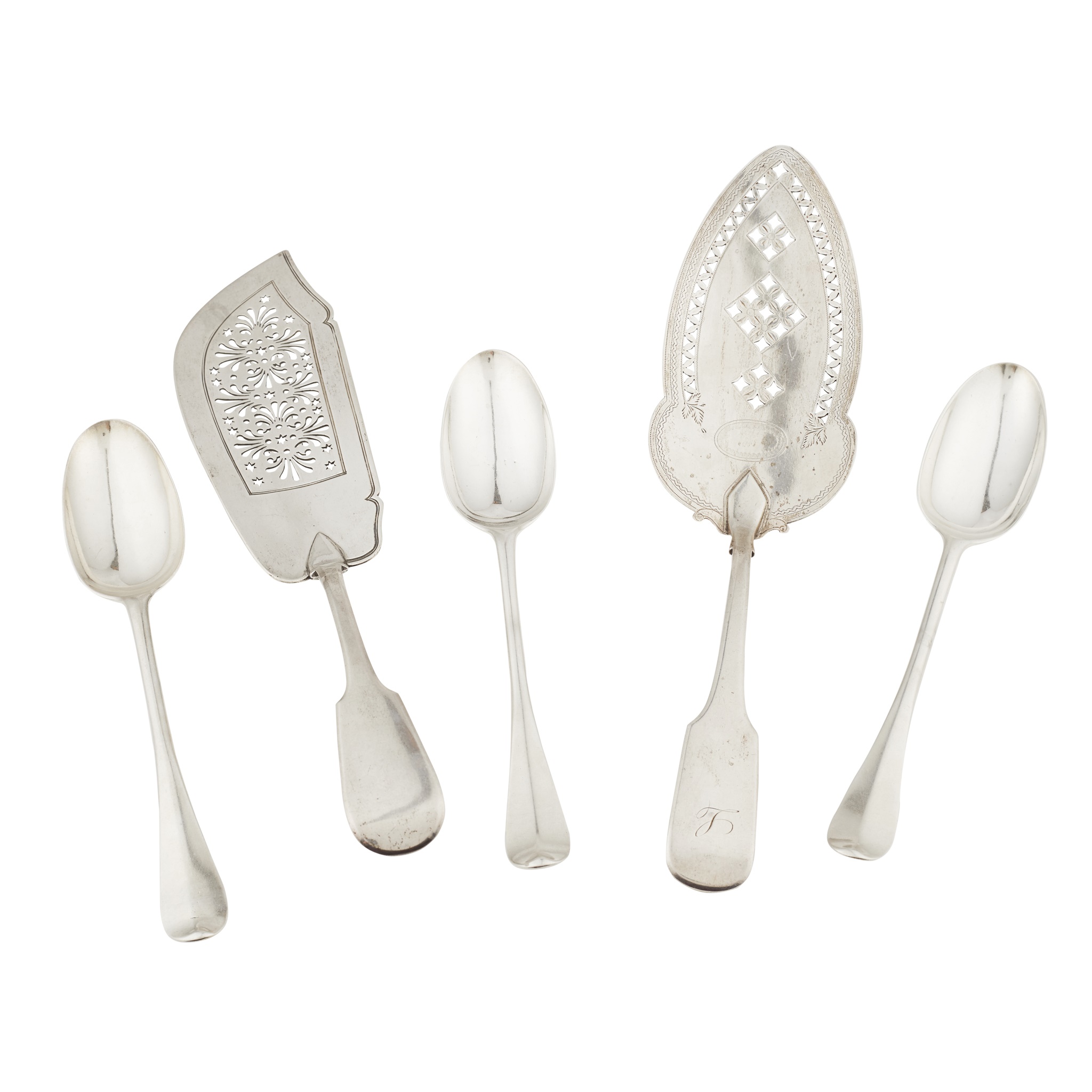 George McHattie, Edinburgh 1808, of Fiddle pattern, pierced blade with foliate decoration, bright cut border, engraved foliate L to terminal; together with a fish slice Charles Boyton, London 1827, of Fiddle pattern and a matched set of three tablespoons, Edinburgh, circa 1750 Patrick Robertson, of Hanoverian pattern