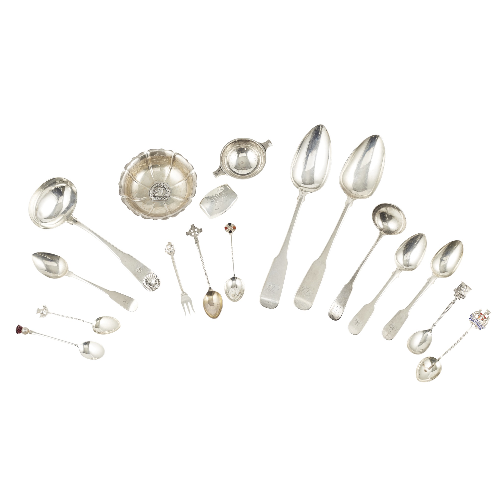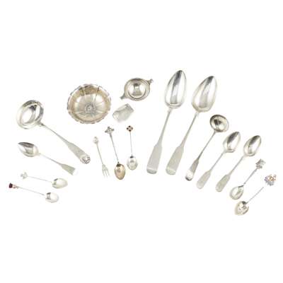 to include; a small quaich, Hamilton and Inches; a pin tray, Chester, lobed circular design, onset silver crest; pair fiddle pattern table spoons, fiddle and shell sauce ladle; pair Dundee teaspoons; cream ladle fiddle pattern; small condiment ladle, Jamieson Aberdeen and London marks; pair Greenock teaspoons, fiddle pattern; a small snuff box, Edinburgh 1977 and a quantity of Scottish town souvenir spoons, various (qty)