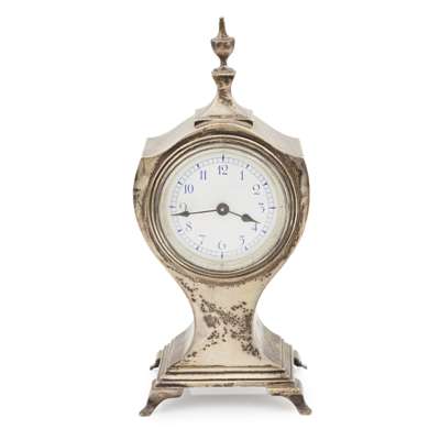 William Comyns, London 1904, the balloon case with tall pointed finial, plain narrow waisted case, splayed base and bracket feet, key wind French movement, white dial with blue Arabic numerals