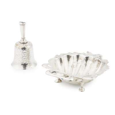 George Frederick Courthope, London 1901, of moulded form, planished finish, raised on three hoof feet; together with a cast planished bell Chester 1910 (2)
