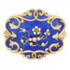 of shaped oval outline, the blue enamel ground with applied scrolling detail and pearl set forget-me-not motif, glazed panel to the reverse with braided hair, engraved inscription to reverse, unmarked, in a fitted box