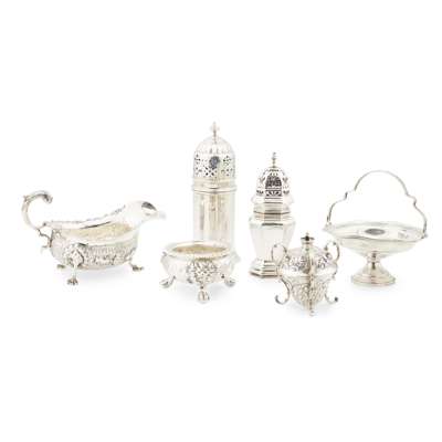 Edward Barnard & Sons Ltd, London 1899, of octagonal baluster form, the pull off domed lid with pierced detail and knopped finial; another Edward Barnard & Sons Ltd London 1939, of cylindrical form, the pull of lid of domed pierced form, knopped finial; together with a sauce boat, George Nathan & Ridley Hayes, Chester 1901, of traditional form, embossed floral decoration throughout with applied pheasant, rabbit and pastoral scene details, raised on three cast shell feet; a George III cauldron salt; a spirit burner and an unmarked sweetmeat basket (6)