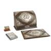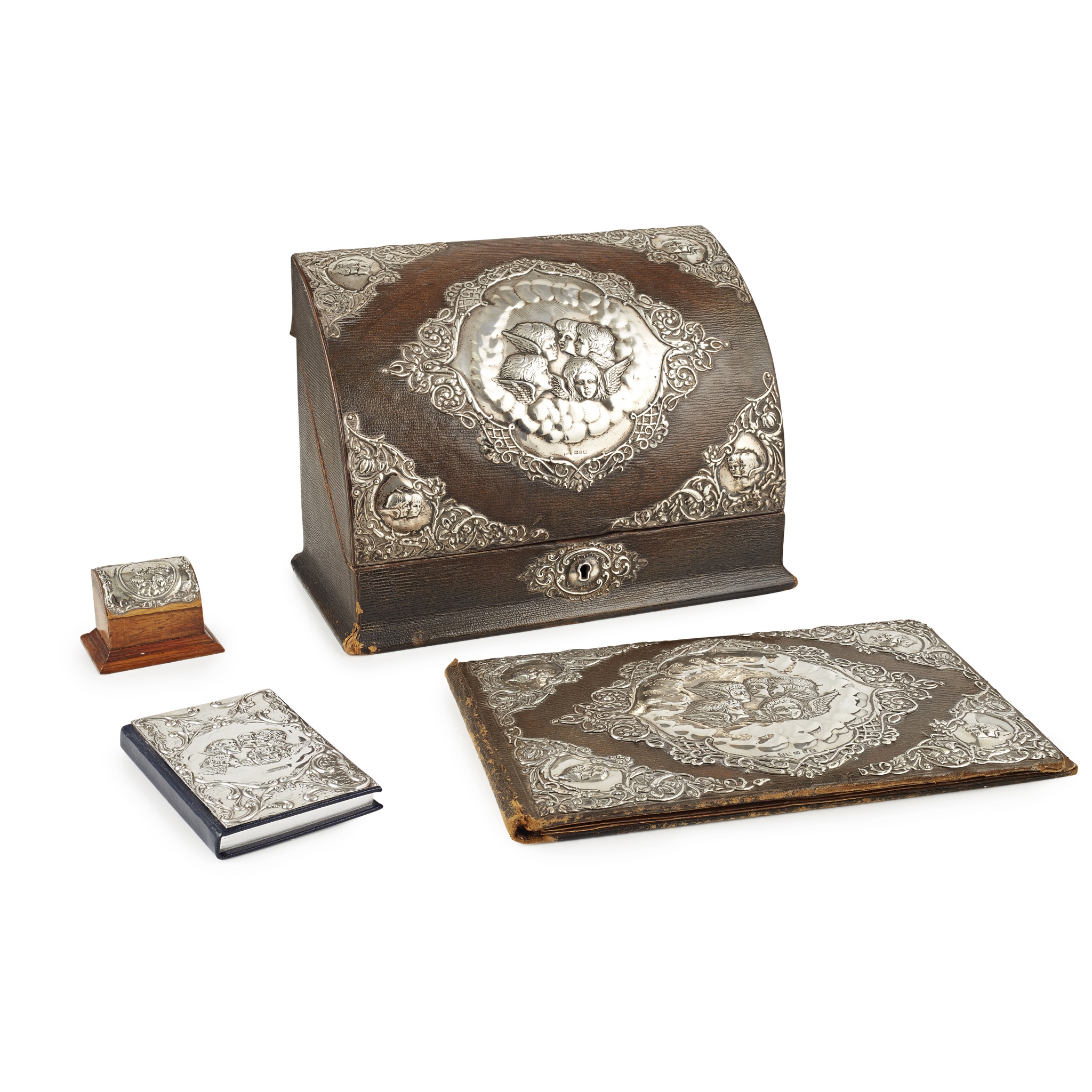 Birmingham 1897, formed of leather with applied silver cherubic details; together with a desk blotter, stamp box and address book, various makers and marks