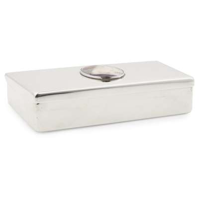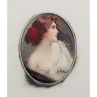 Charles & George Asprey, London 1892, of rectangular form, applied enamel oval portrait of Angelo Asti (1847-1903), with silk lining