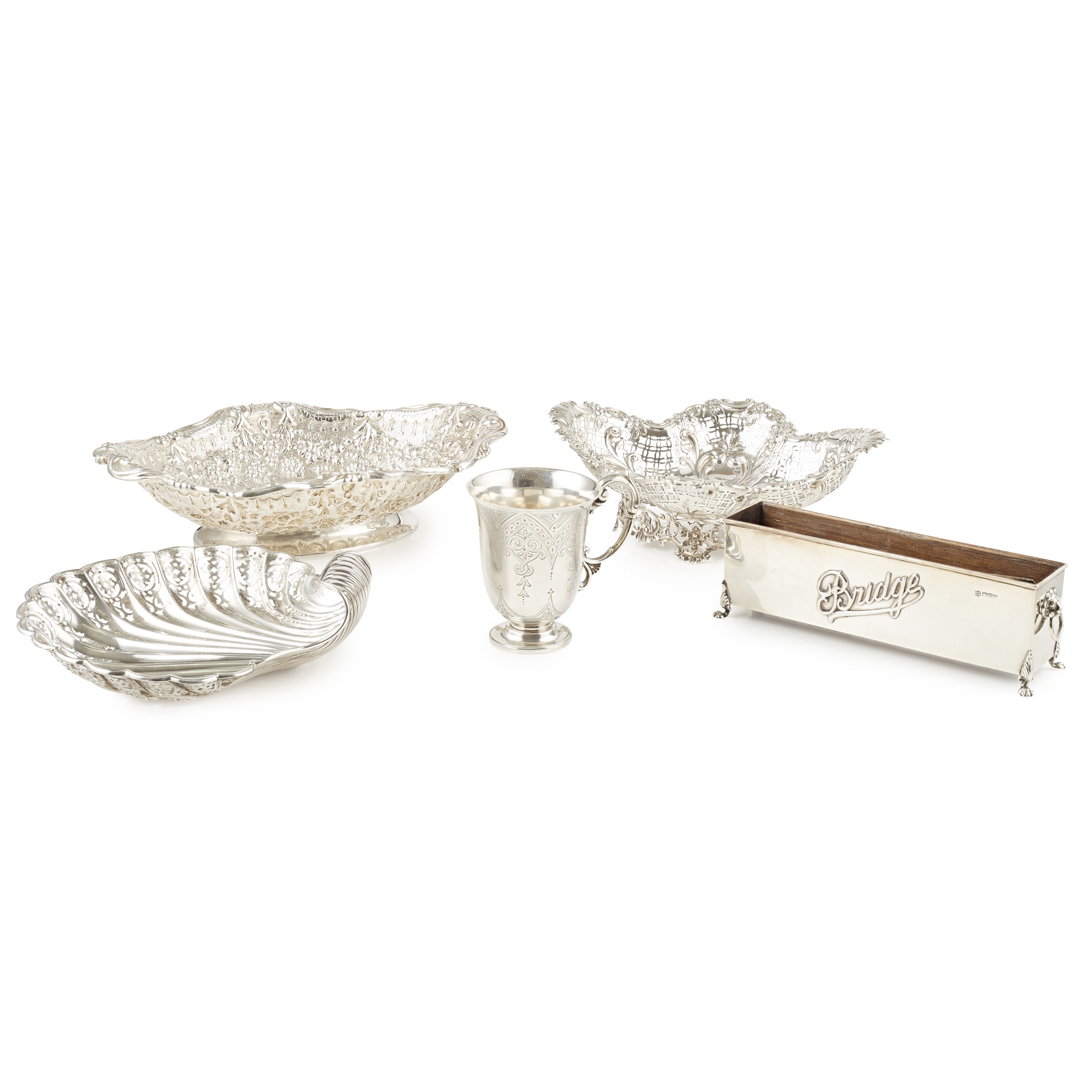 Horace Woodward & Co, London 1890, of moulded oval form, heavily embossed floral raised side with cast scroll border, raised on an oval foot; together with a sweetmeat basket, James Dixon & Sons Ltd, Sheffield 1896, of quatrefoil shape, pierced body with cast floral border, raised on an oval bracket foot; a shell serving dish, Martin, Hall & Co, Sheffield 1902, with pierced border, a Victorian mug, 1860 and a desk accessory George Nathan & Ridley Hayes, Chester 1906 (5)