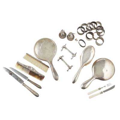 to include; various napkin rings; mother of pearl and silver figural menu card holders; a large collection of various silver handled knives with steel blades; fruit knives and forks; two dressing hand mirrors; carving rests etc. (qty)