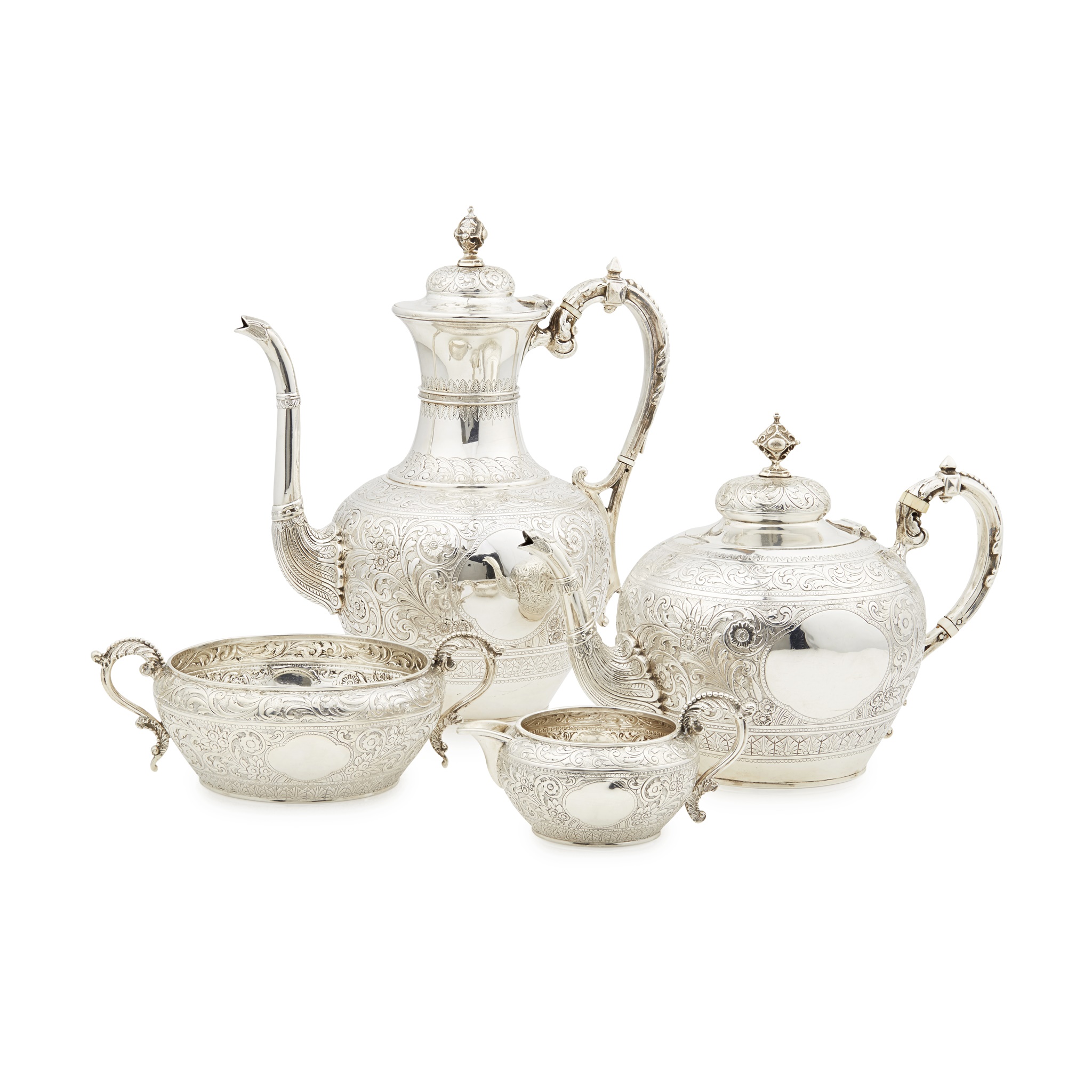 Mappin & Webb, Sheffield 1880, comprising water pot, teapot, twin handled sugar bowl and milk jug, all of circular form, heavily embossed floral and foliate decoration throughout, beaded leaf clasped S scroll handles, vacant cartouches to either side of body, elongated spouts to teapot and waterpot, domed hinged lids with intricate finial