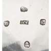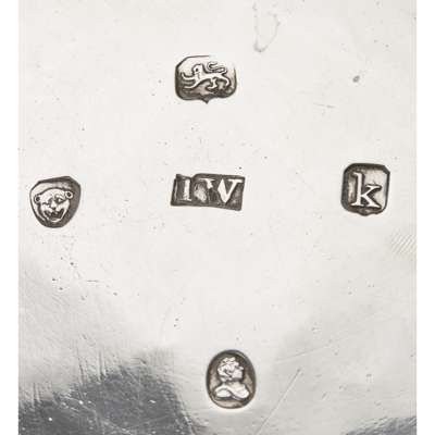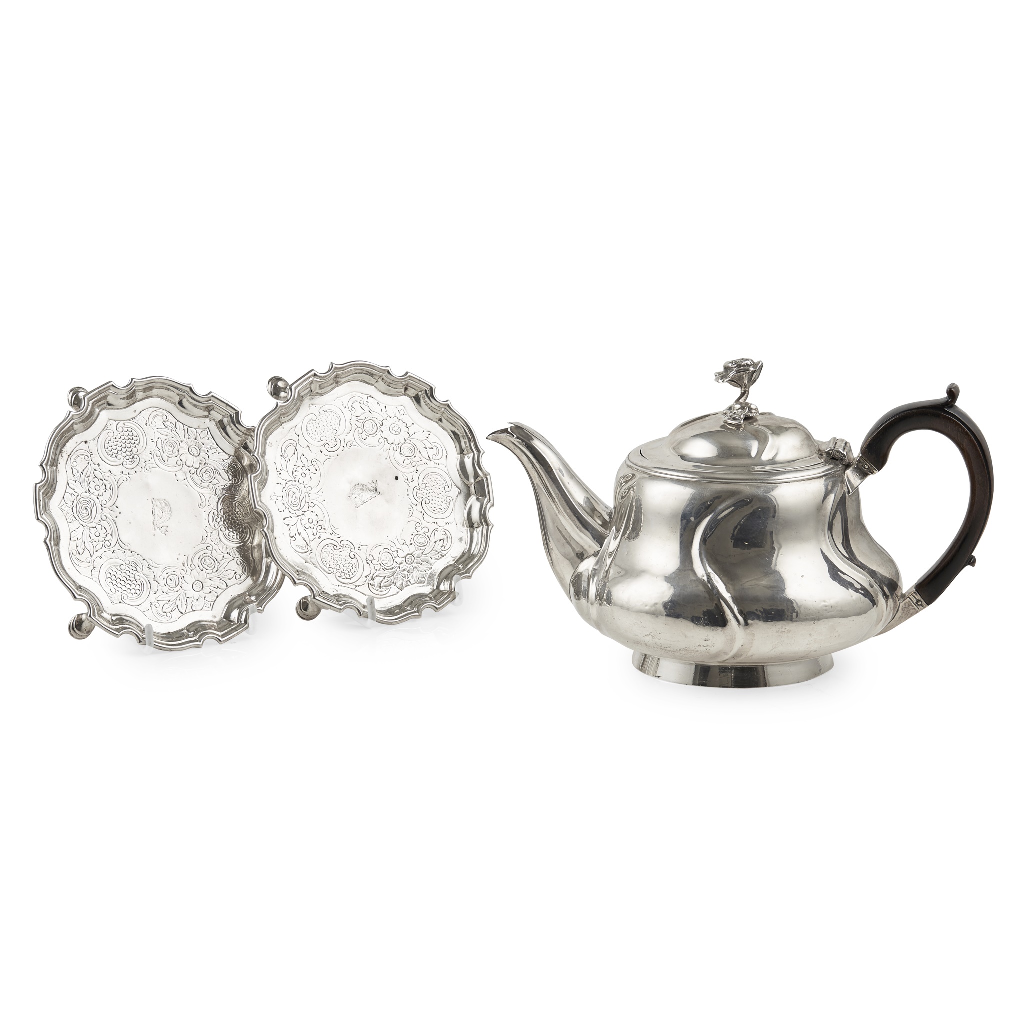 IW, London 1825, of twisted squat baluster form, short spout, rose bud finial, wooden C scroll handle; together with a matched pair of George II card trays, 1732/33, pie crust border, heavily chased inner border with crest to centre (3)