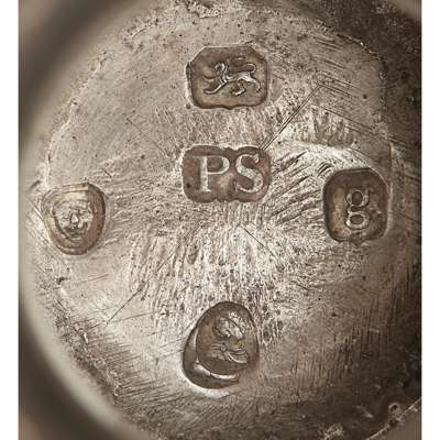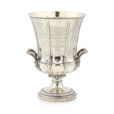 Paul Storr, London 1822, of traditional campana panelled form, lower base with atheneum clasping and fringe border, the twin handles with bearded mask detail, raised on a spreading foot with embossed fluted detail, presentation engraving to body ' WE MEMBERS OF THE ARTISTS FUND... DEEPLY IMPRESSED BY THE IMPORTANT SERVICE RENDERED TO THAT SOCIETY BY WILLIAM MULREADY ESQr. R.A....1822' and list of subscribers'