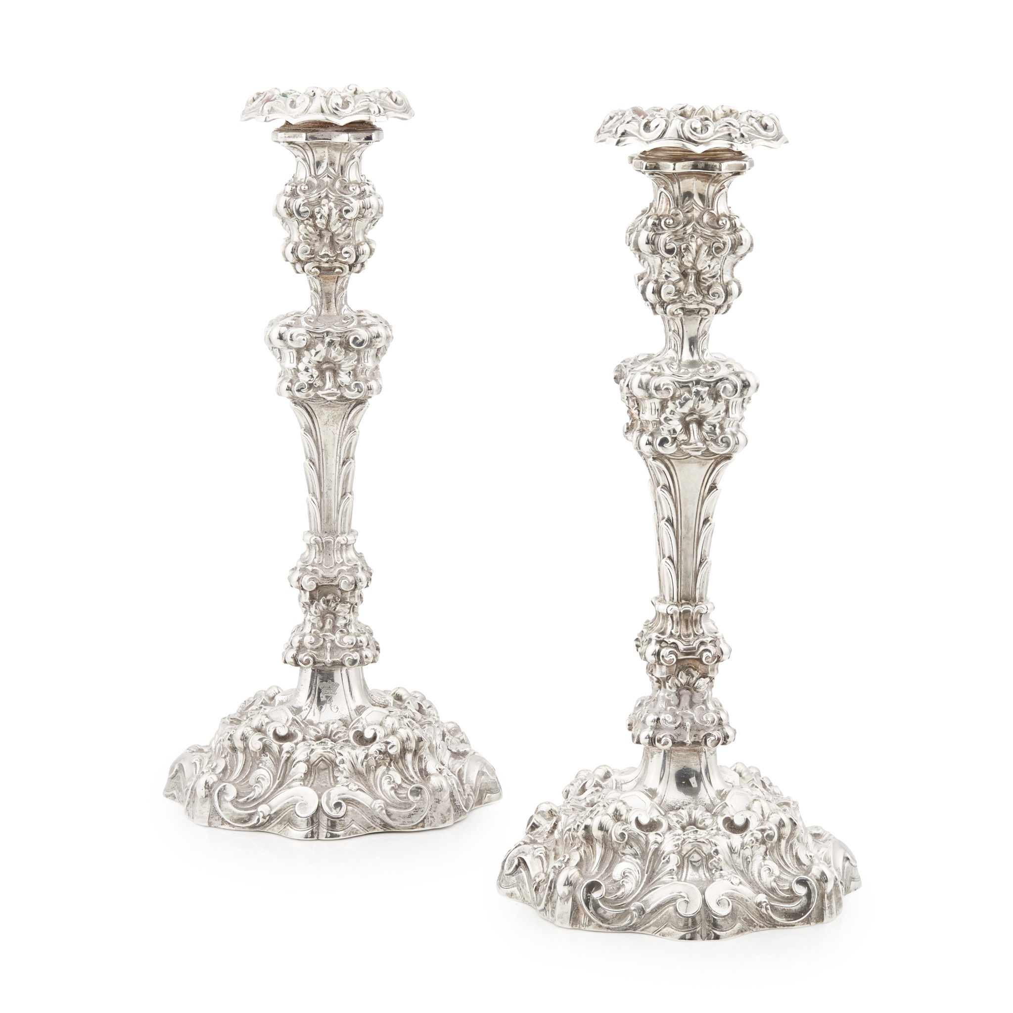 Thomas Blagden & Co, Sheffield 1820, of traditional form, heavily decorated with scroll and foliate detail, the tapered knopped stem with foliate fringe, on a domed and spreading shaped circular base with shell and scroll details, with loaded bases, removable sconces, engraved crest and foliate A to base (loaded) (2)
