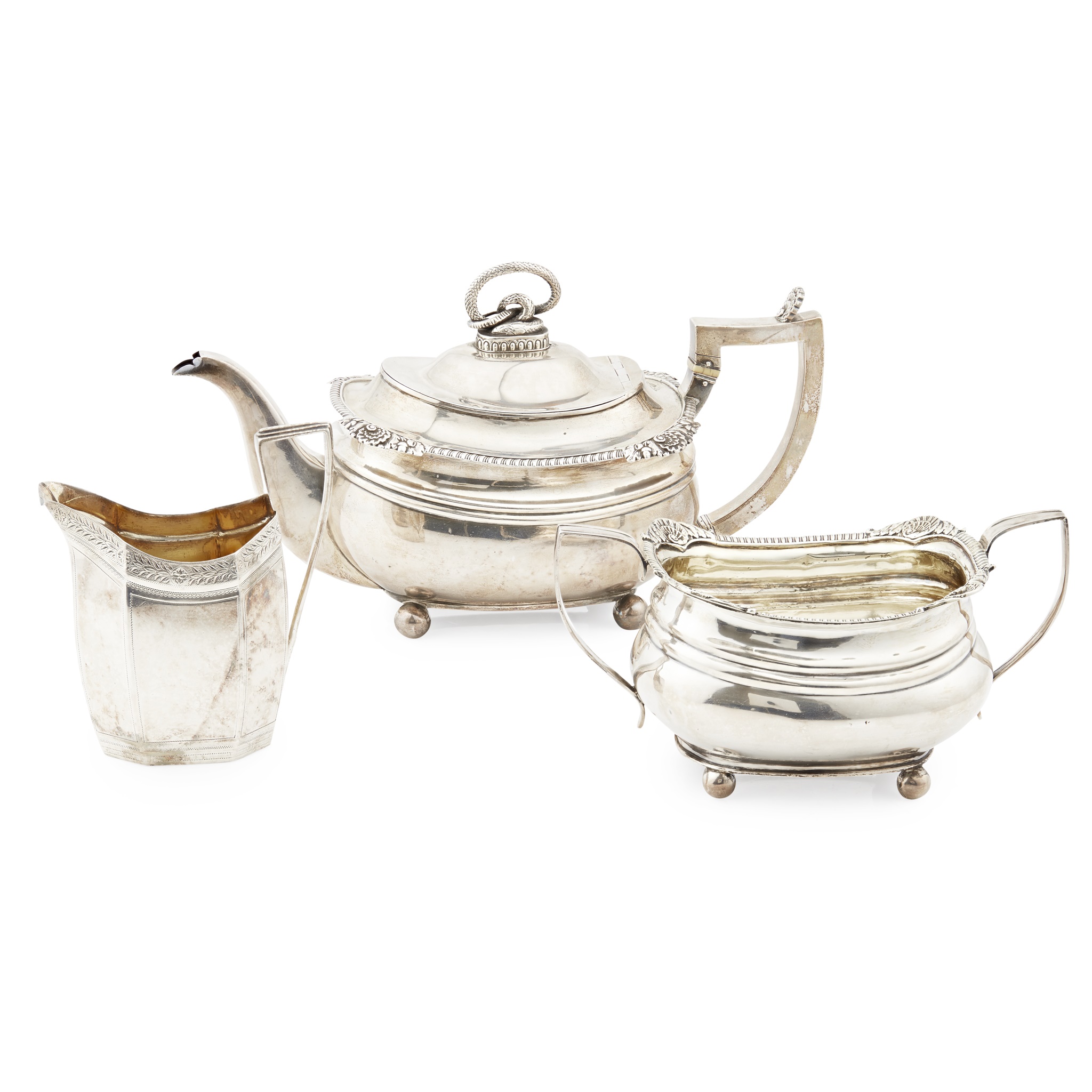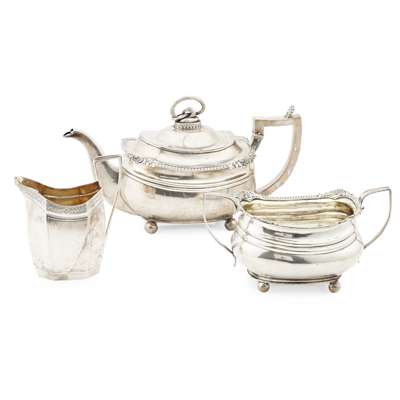 Thomas Radcliffe, London 1815, of baluster rectangular form, angular handles, cast shell, floral and gadrooned border, raised on four ball feet, engraved initials to body, snake twist finial to teapot; together with a silver gilt milk jug, London 1797, of octagonal form, bright cut engraving, angular handles (3)