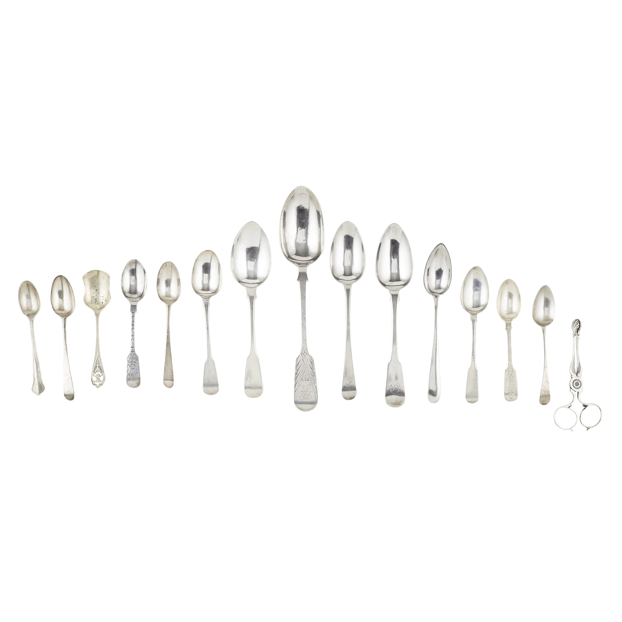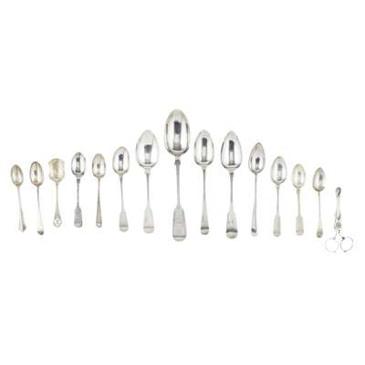 Thomas Dicks, London 1802, of Old English pattern, foliate G engraved to terminal; together with a pair of Fiddle pattern dessert spoons, Edinburgh 1820 and another similar London; a tablespoon, Exeter 1858 of Fiddle pattern, with engraved foliate decoration to stem; together with an assortment of teaspoons, various makers, marks and patterns, some lace and scroll decoration to the reverse of the bowls, a pair of 18th century sugar nips and a jam spoon (qty)