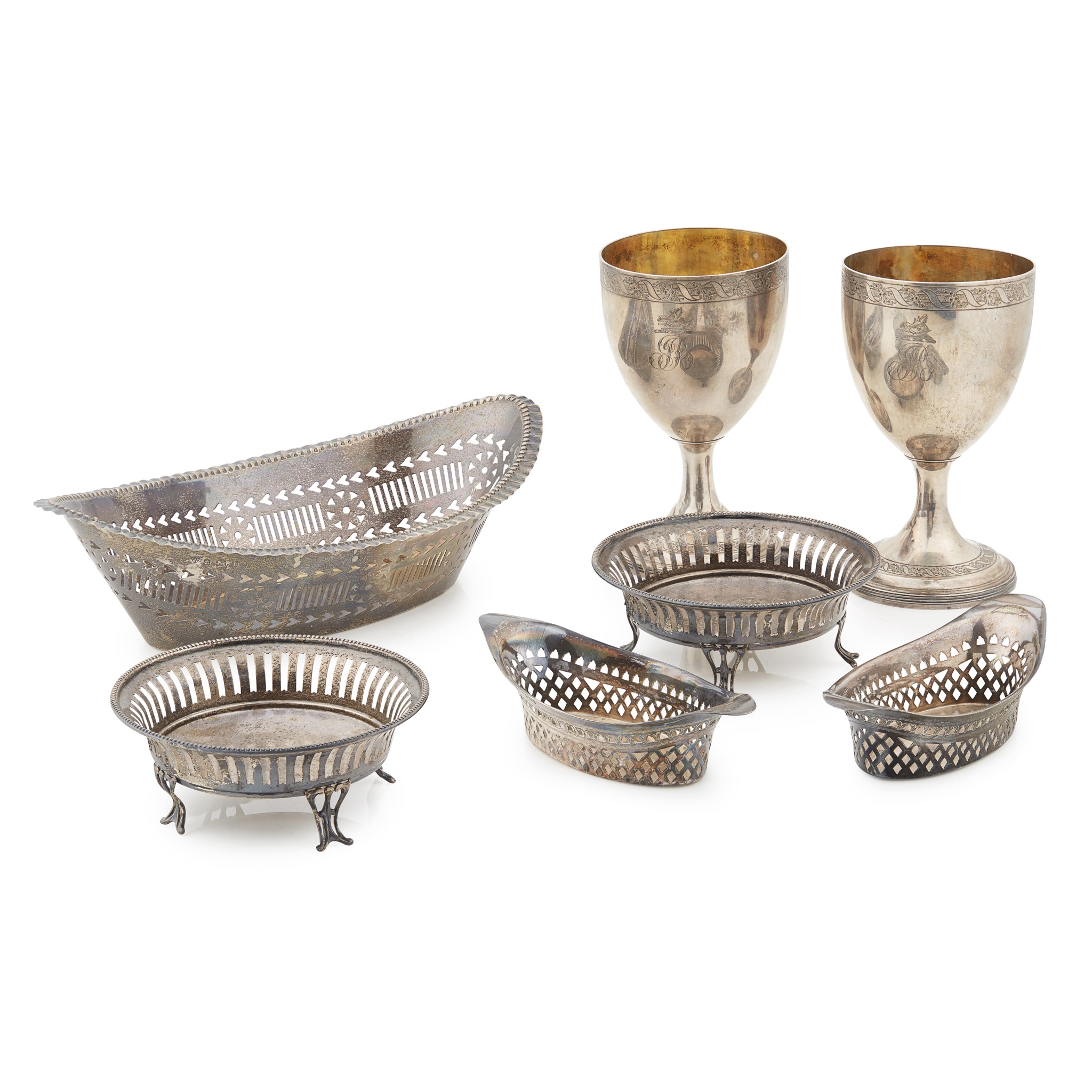 William Fountain, London 1801, of traditional form, the goblet bowl with engraved border, italic JB to centre with crown surmounting, raised of a spreading stem with similar engraved border; together with a pair of circular sweetmeat baskets, smaller oval sweetmeat basket and one larger oval example, all with pierced galleries (7)