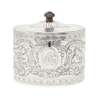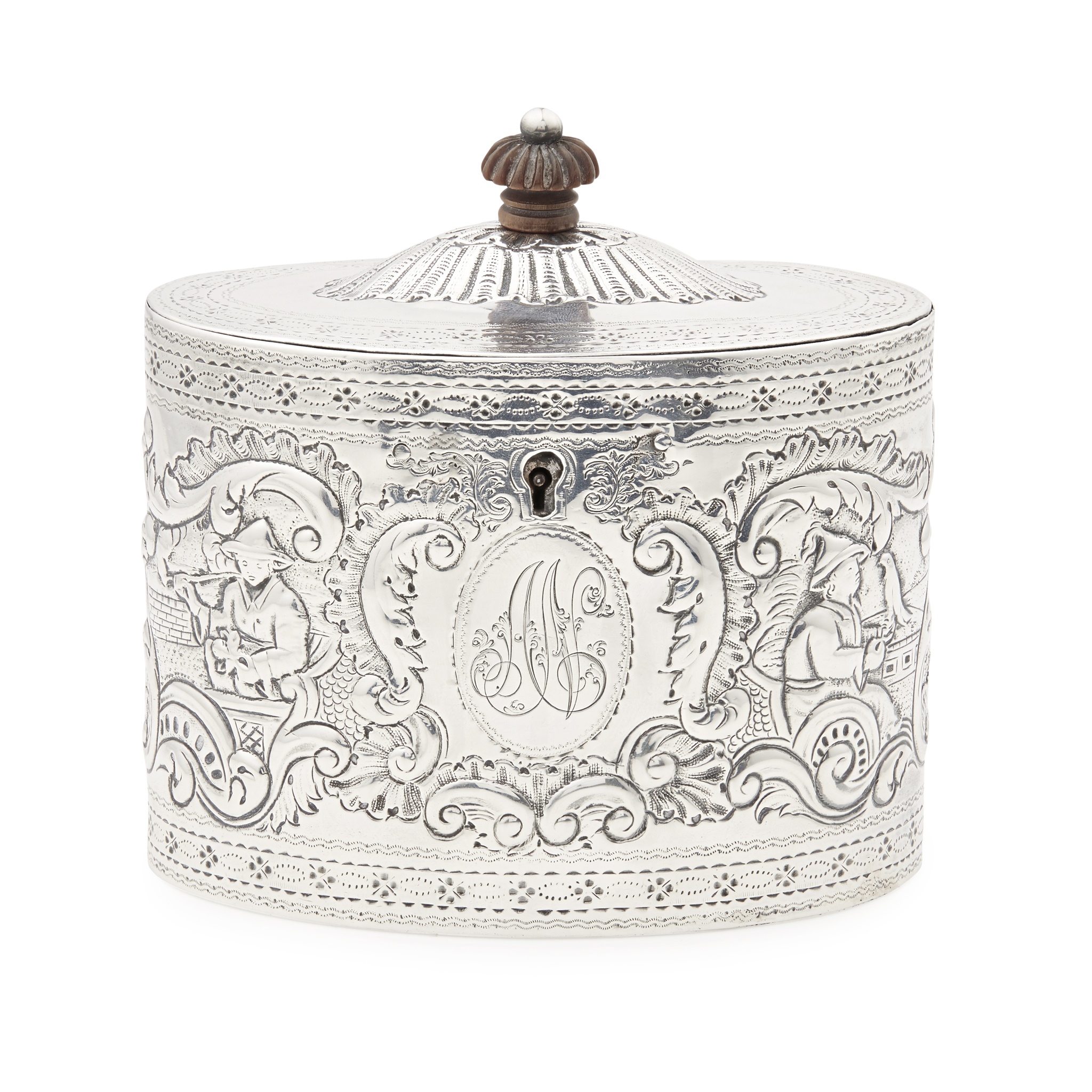 maker's mark indistinct, London 1782, of oval form, bright cut engraving borders, oval cartouche with italic AN, later embossed oriental scenes to body, the hinged lid with similar bright cut engraving domed detail with wooden bud finial