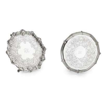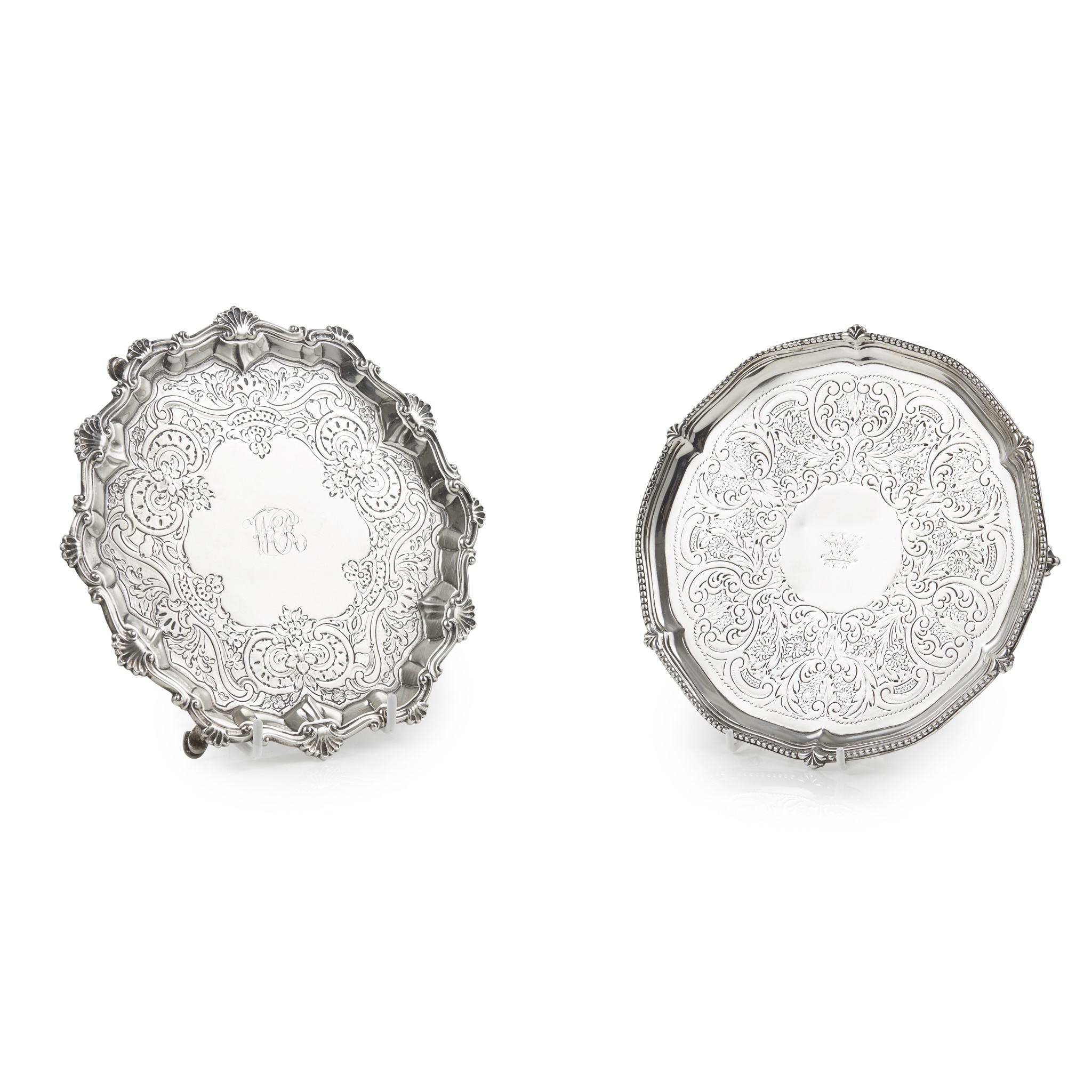Elizabeth Cooke, London 1771, of moulded circular form, cast shell border, engraved foliate detail throughout with italic WER to centre, raised on three hoof feet; together with another John Edwards III, 1791, beaded rim, engraved detail to base, crest to centre (2)