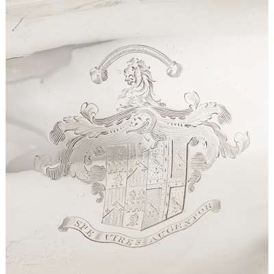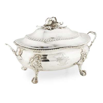 Francis Butty and Nicholas Dumee, London 1770, of oval form and raised on bold scrolling legs with ball and claw feet, scroll handles, the body engraved armorials, the cover with engraved crest and scrolling foliate floral finial