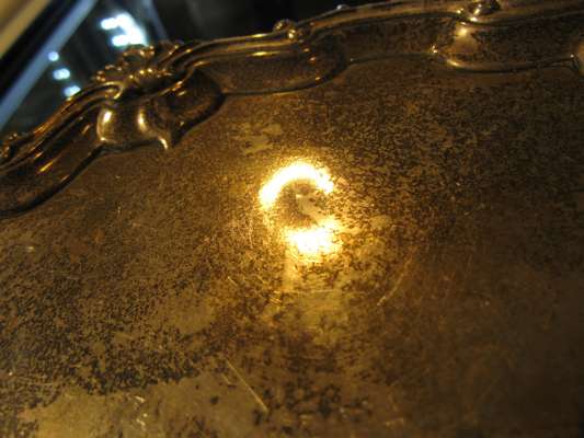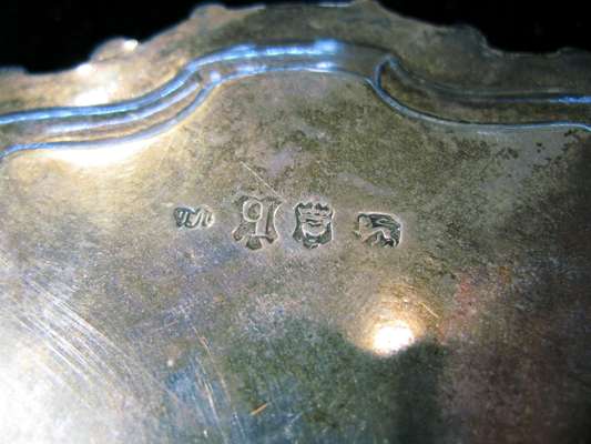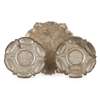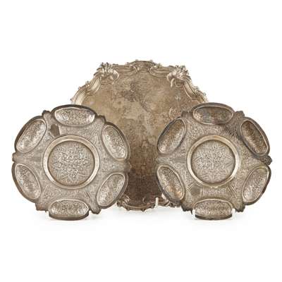 James Morison, London 1751, of moulded circular form, cast shell border, raised on three leaf clasped ball feet, italic B engraved to underside; together with two Persian style dishes stamped STERLING, heavily embossed decoration with seven recesses to the border (3)