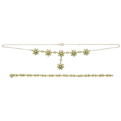 composed of six floral clusters and alternating oval cut peridot links, to an integral chain stamped 9ct; together with a peridot set line bracelet, composed of fourteen claw set oval cut periodots, alternated with 9ct yellow gold scrolling links (2)