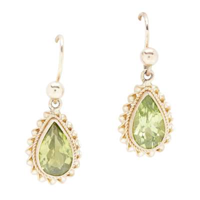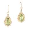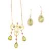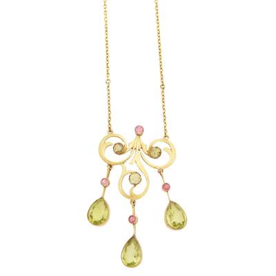 the central scroll plaque collet set with three round cut peridots and one pink tourmaline, suspending three pink tourmaline and pear cut peridots, to an integral chain, apparently unmarked; together with a pair of 9ct peridot set pendant earrings (2)