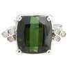 claw set with a rectangular mixed cut green tourmaline, set to each side with a cluster of three collet set round brilliant cut diamonds, to a plain shank, stamped 18K