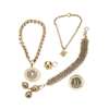 to include, a woven bracelet with suspended ball charms, apparently unmarked; a curb link bracelet with suspended basket charm, stamped 750; a belcher link bracelet with astrological charm, charm stamped 750; together with a landscape brooch, stamped 750 and a separate ball charm (5)