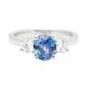 claw set with an oval cut sapphire, flanked to either side by a round brilliant cut diamond, to a plain 18ct white gold shank